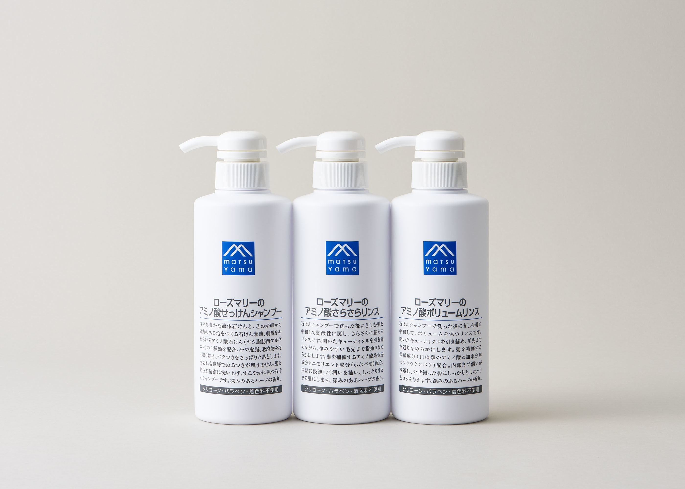 Mマークシリーズの製品に共通しているのは、松山油脂が大切にしている「安全性と環境性、そして有用性のバランス」と「使い続けることができる品質と価格のバランス」です。さらに「成分は必要なものだけ」というブランドの方針も守り続けています。Mマークシリーズのシャンプーとリンス、すこやかな地肌、美しい髪を保つ製品としてお届けします。