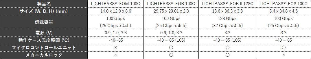 LIGHTPASS(R)シリーズは、アイオーコア株式会社(本社:東京都文京区、代表取締役社長:福田 秀敬)が開発するシリコンフォトニクスIC「IOCore(TM)」を搭載した双方向光通信可能なマルチモードのアクティブ光モジュールです。I-PEXは現在までに「LIGHTPASS(R)-EOB 100G」「LIGHTPASS(R)-EOM 100G」の2種類のアクティブ光モジュール製品を開発、評価用デモキットを供給しています。この度の高温環境化での長期信頼性に優れた新製品「LIGHTPASS(R)-EOB II 128G」「LIGHTPASS(R)-EOS 100G」によって製品ラインナップを拡充し、サーバーを始めとした幅広いアプリケーションで機器内部の光伝送を実現できる体制を構築します。