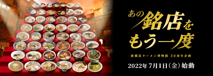 新横浜ラーメン博物館(横浜市港北区、代表取締役:岩岡 洋志)は、30周年を迎える2024年へ向けた取り組みとして、過去に出店した約40店舗の銘店が2年間かけ、3週間のリレー形式で出店するプロジェクト「あの銘店をもう一度」を2022年7月1日(金)よりスタートします。