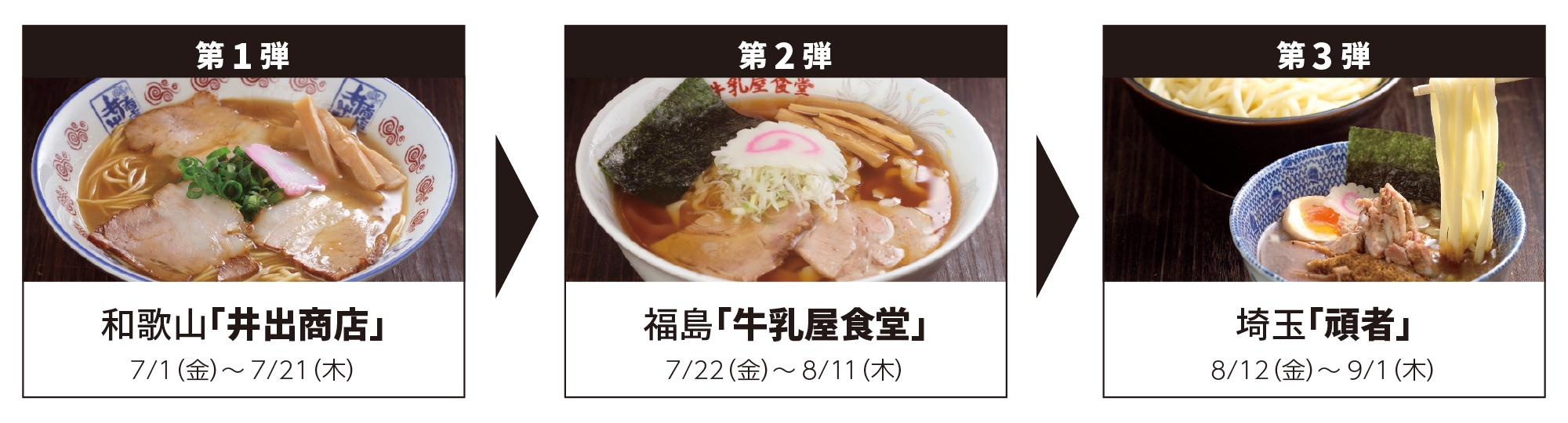 井出商店に続く2店舗目には創業90余年の歴史を持つ会津屈指の老舗、福島県会津若松「牛乳屋食堂」、3店舗目には「極太麺×濃厚つけダレ×魚粉」という、それまでになかったつけ麺のスタイルを確立し、その後活躍するお店に大きな影響を与えた、埼玉川越「頑者」にご出店いただきます(※第4弾以降の出店スケジュールは、改めてお知らせいたします)。