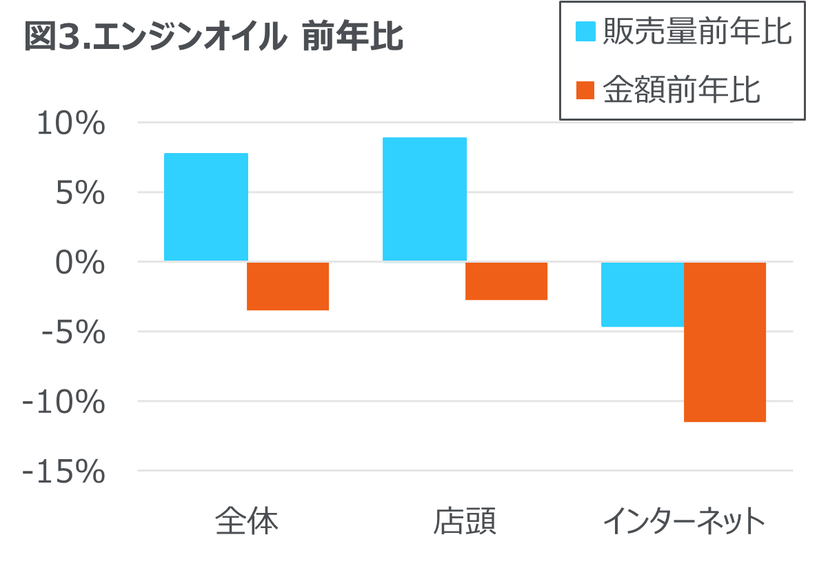 2024年上半期の販売量前年比は8%増と堅調であった(図3)。店頭では同9%増であったものの、インターネットでは同5%減と低調であった。エンジンオイルの販売形態をみると、店頭では量り売りが増加しており、販売量前年比18%増に達した。一方、缶売りは店頭、インターネットともに同3%減と前年を下回り、特に4L缶では同10%減の落ち込みとなった。エンジンオイル全体の1リットルあたりの平均価格は店頭では前年から11%下落し753円、インターネットでは7%下落し789円となった。その結果、販売量ではプラス成長であったものの金額ベースでは全体で前年比3%減と前年を割り込み、店頭では同3%減、インターネットでは同11%減であった。