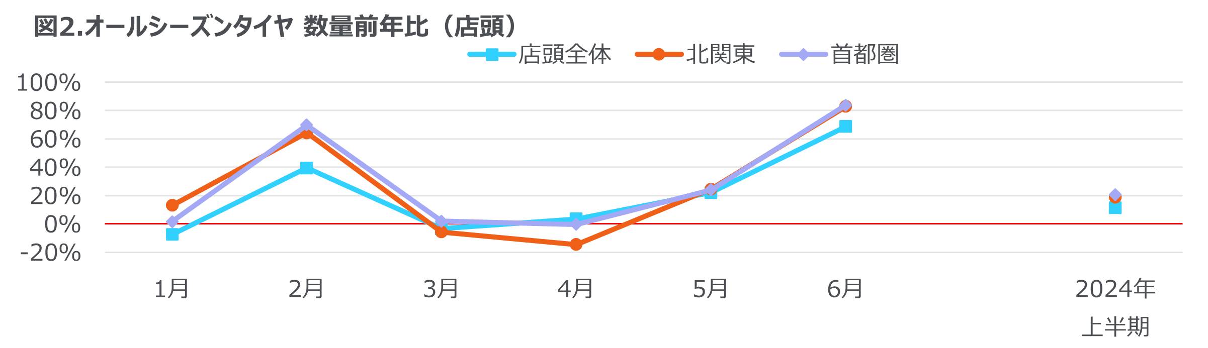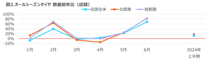 オールシーズンタイヤの2024年上半期の数量前年比は全体で34%減と大幅な減少となったが、店頭販売では同11%増と二桁成長を見せた(図2)。特に北関東と首都圏で販売が伸びており、数量前年比はそれぞれ19%増、21%増に至った。これは2月の降雪による影響が大きく、北関東、首都圏では前年同月の1.6倍を超える規模となった。