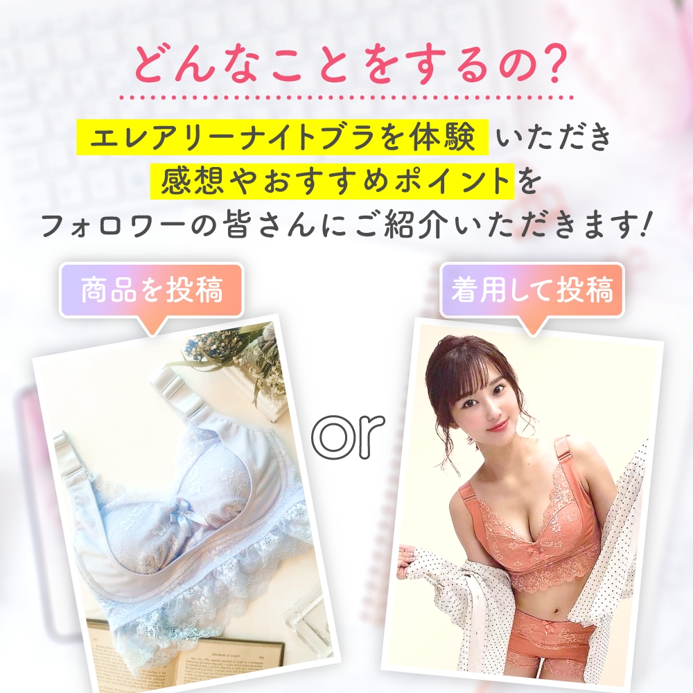 アンバサダーとしてエレアリーナイトブラのPRをお手伝いしてみませんか?エレアリーナイトブラを体験いただいてSNSで紹介するだけでOKです。