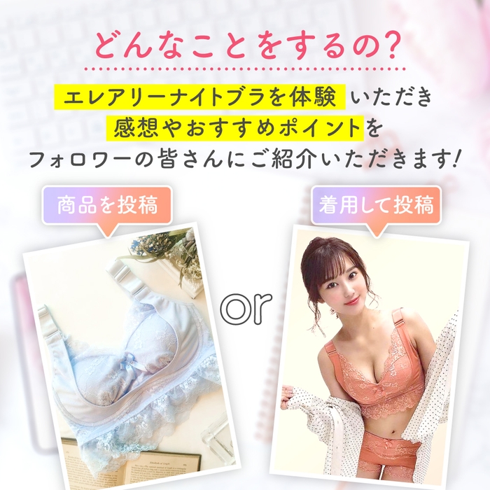 アンバサダーの方に行なっていただくことは、実際にエレアリーナイトブラを着用し、使用感やおすすめポイント、気に入ったところをSNSに投稿するだけです。