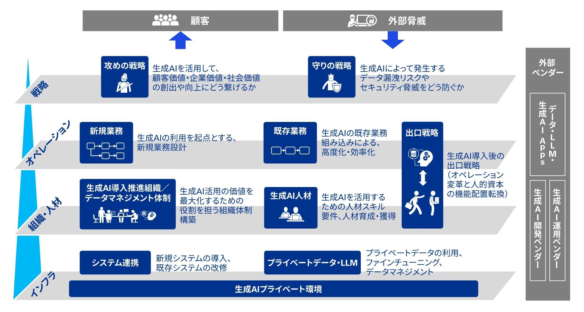 生成AIマネジメント戦略(生成AI利活用領域のオペレーション、組織・人材、システムの変革)の実行を支援します。