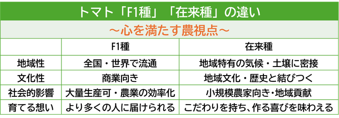 マイファームでは、F1種・在来種ともに農業において大切な存在と考えています。お腹をいっぱいにする農業を支えてくれるF1種。地域・伝統文化など心もいっぱいにする農業を支えてくれる在来種。経済合理性や時代の変遷で淘汰されていく中で、両者の存在に光を当てて、「農を楽しむ」からこそ次世代に繋いでいけることがあると思っています。今回のプロジェクトをきっかけにトマトを通して、そうした部分を感じていただければ幸いです。