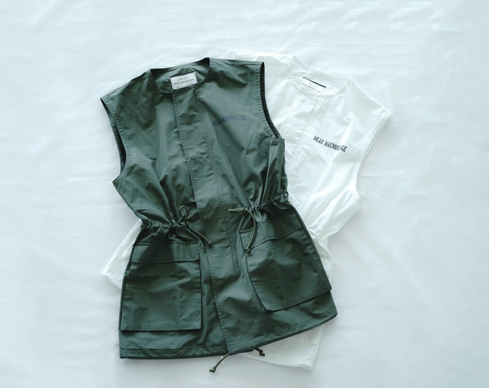 ミーンマシーンエイジに別注オーダーしたベストは、雰囲気に合わせてアレンジが可能なドロストデザインやヒップをさりげなくカバーしてくれる丈感、光沢感の美しいポリエステル素材を使用した、女性にも取り入れやすいミリタリーアイテムです。羽織るだけでトレンド感のあるコーディネートが完成します。
