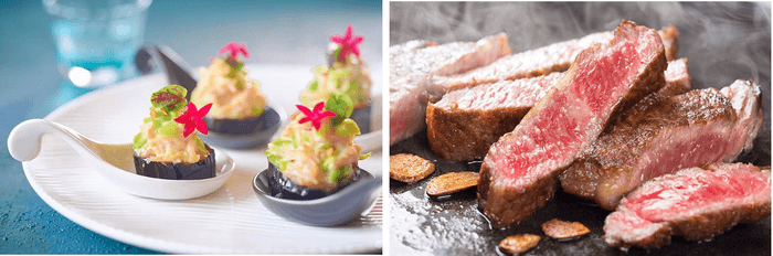左:ヘルシーなチキンを中東発祥、ナッツの香ばしさとクミンやコリアンダーの風味豊かな「デュカスパイス」で味付けし、茄子の上に乗せた夏らしさ溢れるアミューズ。