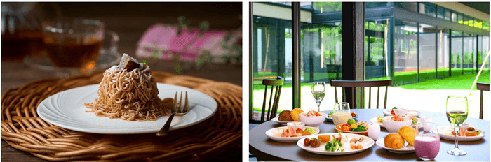 左:お客様の目の前で仕上げる「しぼりたてモンブラン」。マロンクリームを搾る様子を見て楽しんだ後は、搾りたてのクリームならではの軽い口当たりと濃厚な甘さをお楽しみください。