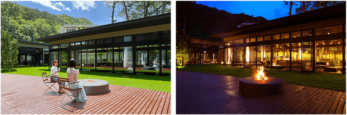 本物の薪をくべるファイヤーピットを中心に、日中はもちろん満天の星空を眺める夜もお客様が集う空間です。