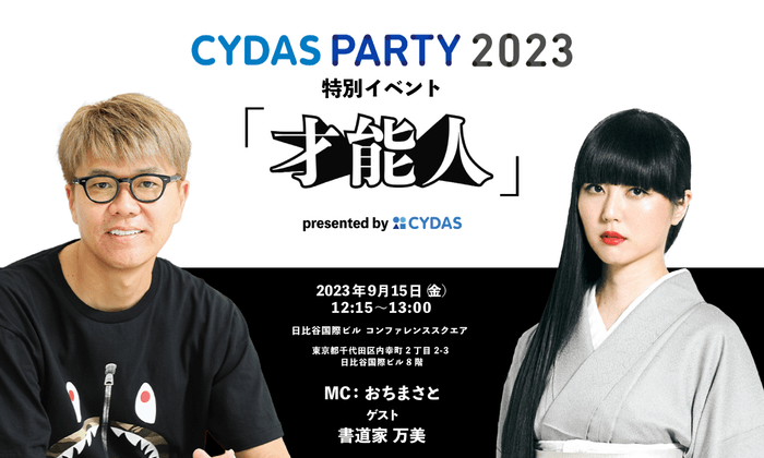 「CYDAS PARTY 2023」では、独自のスタイル”MAMIMOZI”を信念に、様々な企業のプロモーション出演や題字を手掛ける書道家 万美氏をゲストに迎え、45分間の生対談を実施。書家を志したきっかけや、彼女の表現活動の原動力に、おちまさと氏が迫ります。