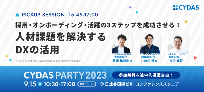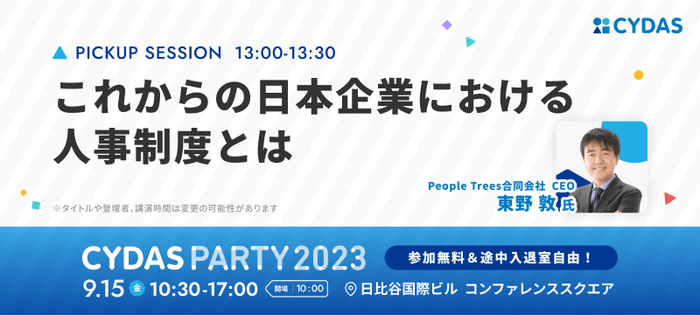「CYDAS PARTY 2023」は、これからの人事と経営が知っておくべき最新テクノロジーの成功事例やノウハウが1日で学べる参加費無料(事前予約制)のオフラインイベントです。