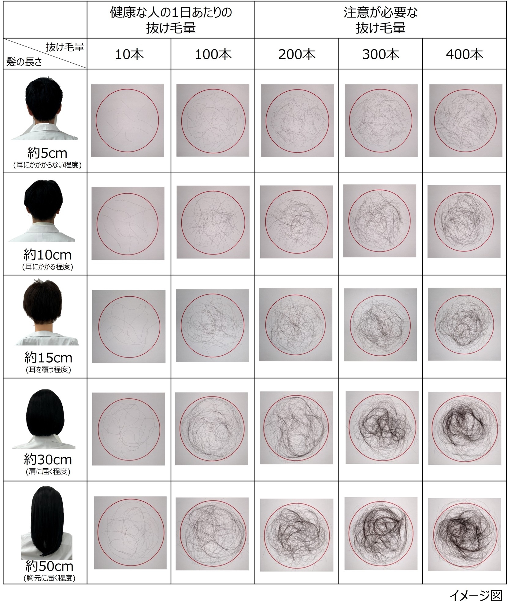 そこで、自分の抜け毛量をイメージしやすいように、髪の長さ別に1日の抜け毛量を可視化しました。その結果、同じ抜け毛本数であっても、髪の長さによって印象が大きく異なりました。