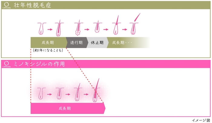 ※2 進行性の脱毛のすべてが、壮年性脱毛症であるとは限りません。壮年性脱毛症以外の脱毛症であったり、脱毛が他の原因によるものである可能性があります。急激に脱毛したり、髪が斑状に抜ける場合は壮年性脱毛症以外の可能性が高いので、医師又は薬剤師にご相談ください。