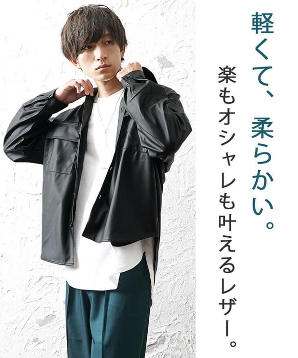 一般的に無骨で男らしい印象のレザージャケットをトレンドのゆったりスタイルに馴染むようアレンジ。