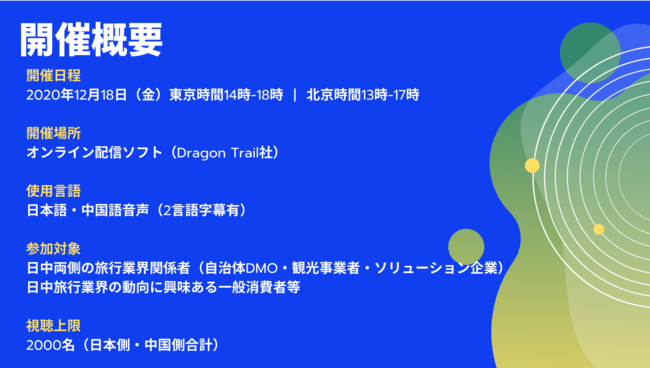 参加対象:日中両側の旅行業界関係者(自治体DMO団体・観光事業者・各種ソリューション企業等)と日中両側旅行業界の動向に興味ある一般消費者等