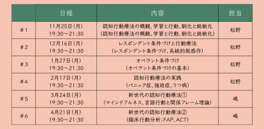 認知行動療法を、基礎となる理論を含めて、しっかりとした講師から、じっくりとゼミ形式で学びたいという声にお答えし、「すいすい学べる認知行動療法」オンラインゼミを企画しました。第1期は、ご好評のうちに終了しました。