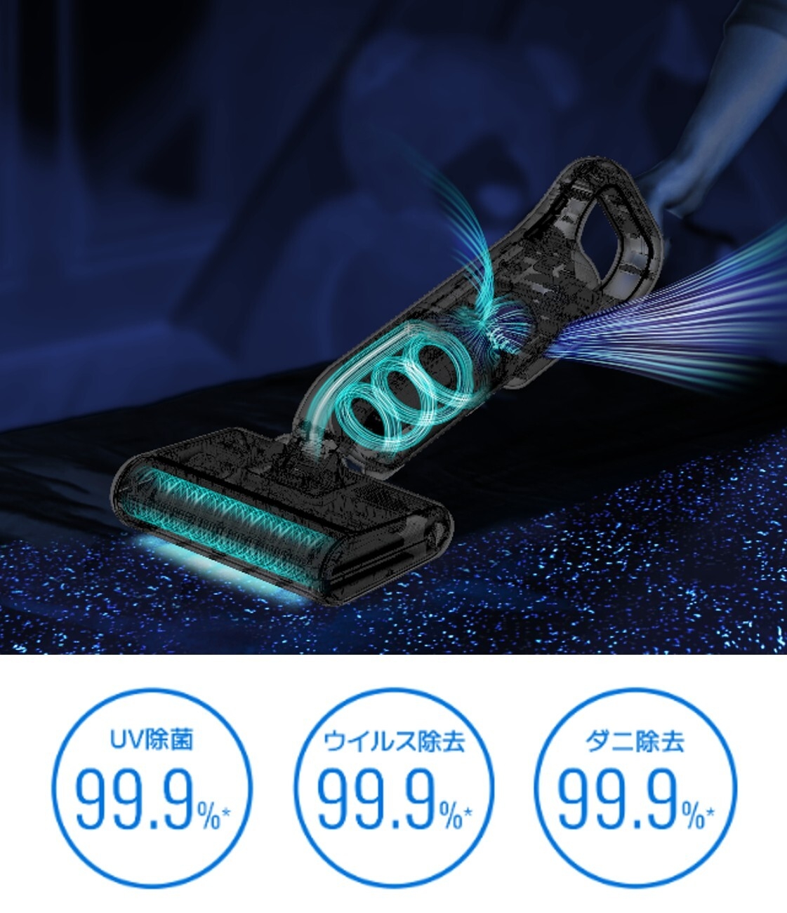 医療現場でも使用されているUV (UV-C)LEDと、高速回転たたきブラシ・強力吸引によるレイコップ独自技術の『光クリーンメカニズム』で、アレルゲン・菌・ダニを99.9%除去*1。