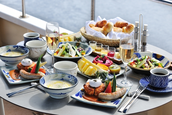 2 船上で楽しむ南国フルーツとシャンパーニュの朝食