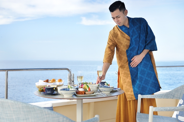 クルーズには、専属バトラーとして星のや沖縄のスタッフが同行し、朝食の提供を含めて快適なクルーズができるようサポートします。海の色の多様さや美しさの理由など、海に関係するガイドトークも行います。青の洞窟や目の前に広がる海の色をつくる背景が分かると、また違った視点で景色を楽しむことができます。