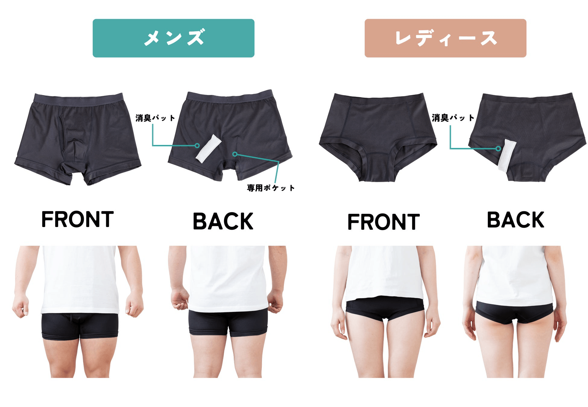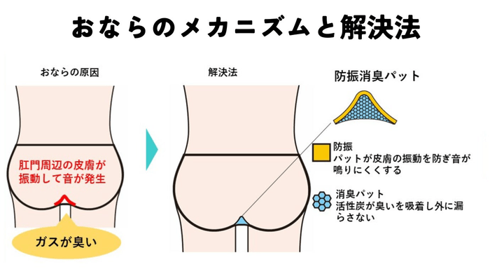 おならの原因となる、肛⾨周辺の⽪膚の振動を抑え、発⽣するガスのニオイを吸収する活性炭が⼊った専⽤パットをパンツ内部のポケットに挿⼊することで機能を発揮します。