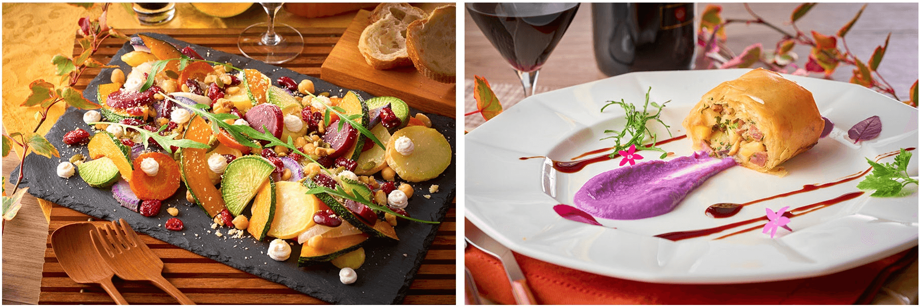 左:アメリカやカナダで盛大に祝われる秋の行事、サンクスギビングデーでは、七面鳥料理と一緒にシンプルな野菜料理を食べる習慣があるそう。大地の恵みに感謝を込めた、彩りも美しいサラダをお楽しみください。