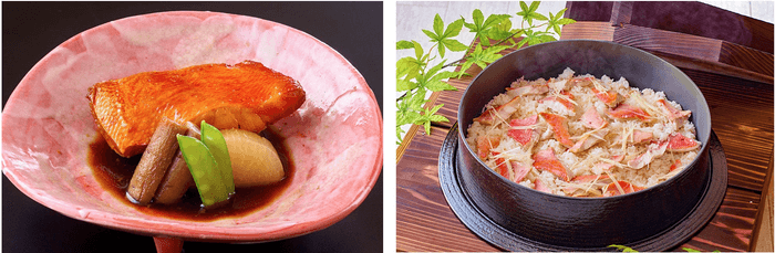右:朝食でご提供する「金目鯛の炊き込みご飯」。金目鯛の上品な白身、旨味が染み込んだお米を楽しむ炊き込みご飯です。二膳目は出汁をかけてお茶漬けスタイルで。豊富な具材で思い思いのアレンジで楽しめる「大江戸のっけ丼」もお見逃しなく。