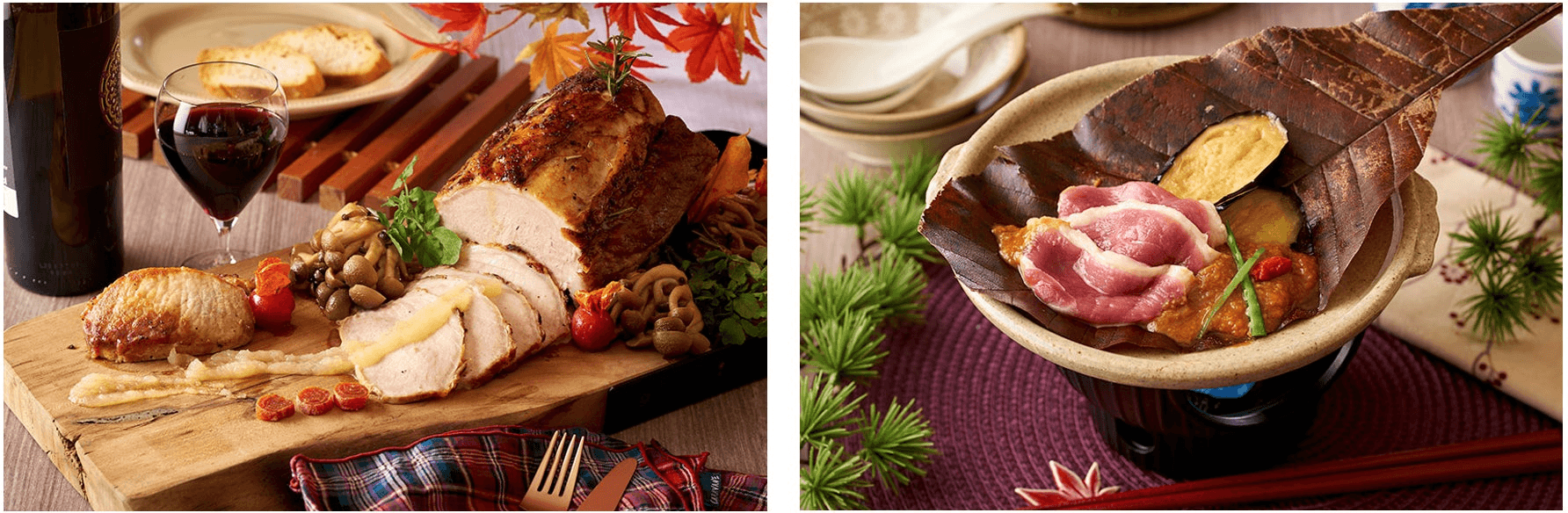 左:飛騨ポークを低温でじっくり火を通したロースト料理。飛騨産きのこを使った味わい深いソースを添えて。