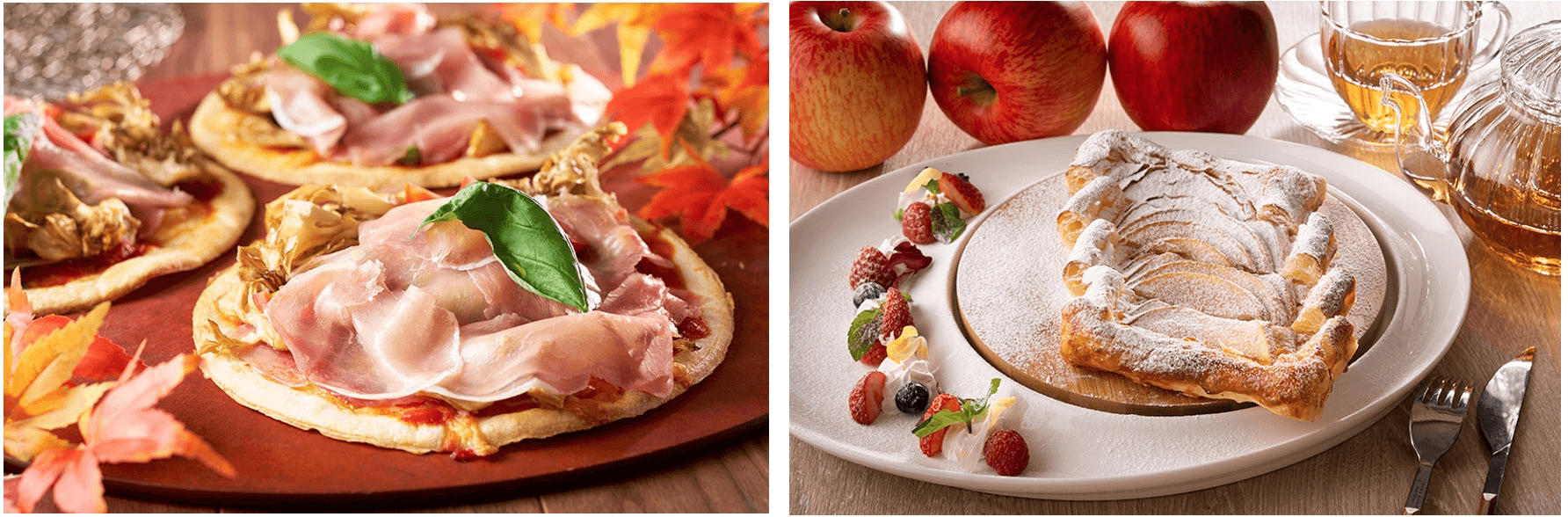 左:ライブキッチンから焼きたてをご提供するピッツァ。地元で収穫された香り高い舞茸に塩気が絶妙な生ハムを合わせたシンプルな美味しさをお楽しみください。