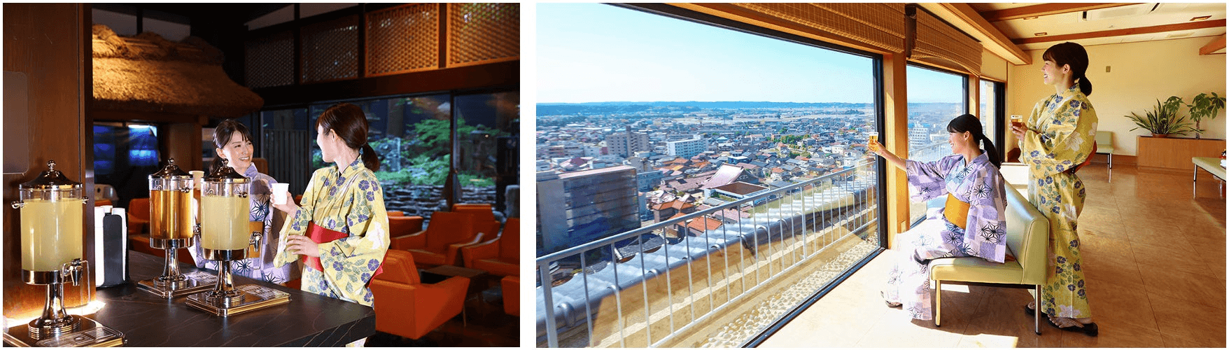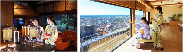 落ち着いた雰囲気の中で加賀棒茶やお菓子、アルコールを楽しめるメインラウンジの他に、最上階の展望ラウンジでも、湯上りに生ビールやハイボールを無料でお楽しみいただける山下家。