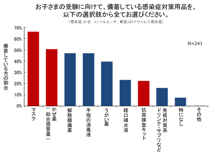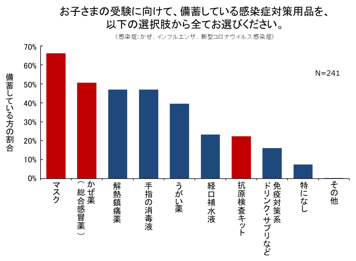 また、今回の調査では受験に向けた感染症対策として「マスク」や「かぜ薬(総合感冒薬)」を常備しているご家庭が半数を超えました。さらに、抗原検査キットも、約2割のご家庭で常備していることが分かりました。一般用の抗原検査キットは、2022年から薬局やインターネット等で購入できるようになったこともあり、ご家庭によっては感染症対策の選択肢の1つとして取り入れられているようです。
