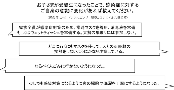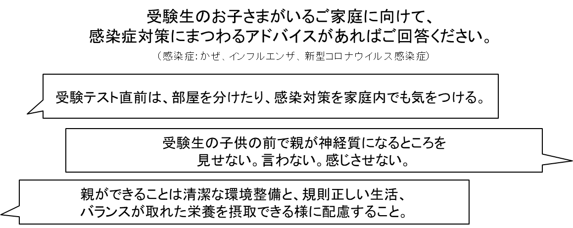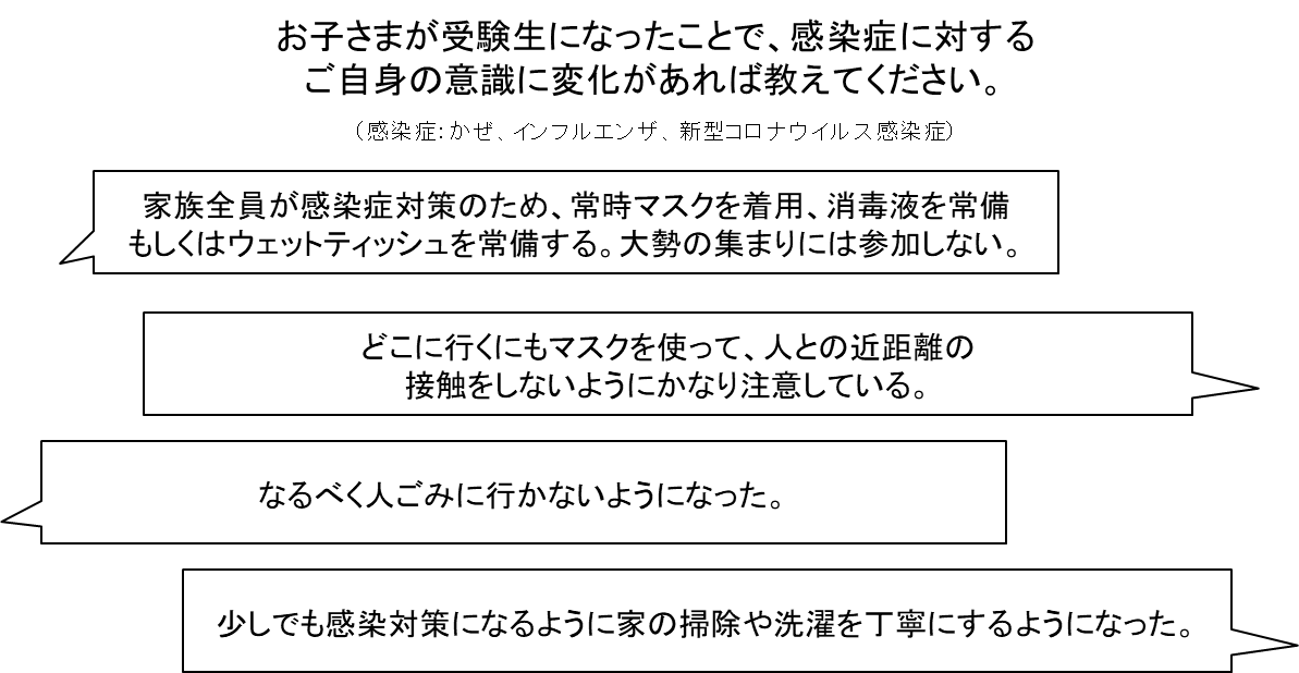 今回の調査では、同じく受験生を持つ保護者の方々から、感染症対策に関するアドバイスが寄せられました。家庭内で人との接触を減らす物理的な対策から心理的な気遣いに至るまで様々な工夫をされていることがわかりました。