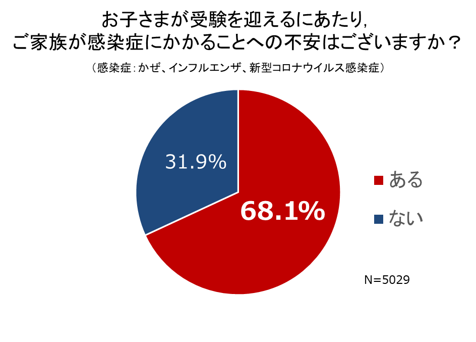 いよいよ受験シーズンを目前に控え、かぜやインフルエンザ、新型コロナウイルス感染症などの感染症が気になる時期になりました。この度、大正製薬が実施した調査では、この冬に中学・高校・大学受験を控えたお子さまがご家庭にいる方(5029人)のうち、約7割の方が「ご家族が感染症にかかることに不安がある」と回答しました。