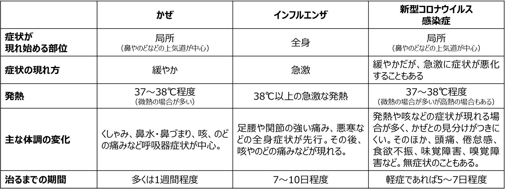 かぜ・インフルエンザ・新型コロナウイルス感染症は症状が似ており、見分けるのが難しいことがあります。いざという時に慌てないためにも、それぞれの特徴と対処を知っておきましょう。