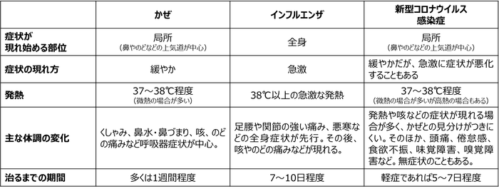 <かぜ・インフルエンザ・新型コロナウイルス感染症の違い>