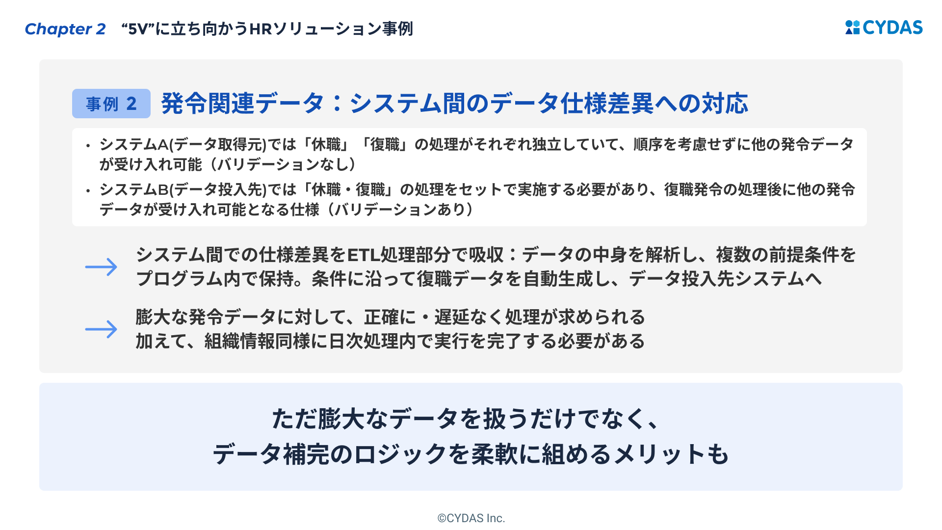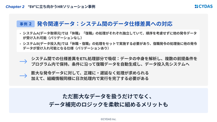 続いて、サイダスがDALと連携し進めた2つのプロジェクトを事例として紹介。DALの「ACMS Apex」を活用することで、膨大かつ複雑な人材データを扱う基幹システムと「COMPANY Talent Management」シリーズをWeb APIで連携し、人材データの統合・変換プロセスを最適化した好事例を紹介しました。