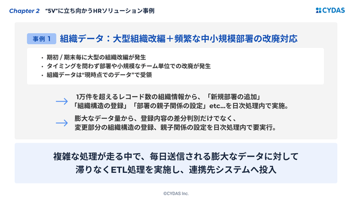 登壇の冒頭では、サイダスが人材情報を扱う中で直面するビッグデータ特有の課題として、「Volume(量)」「Variety(多様性)」「Velocity(速度)」「Veracity(情報の正確さ・信憑性)」「Value(価値)」の5つの視点が重要であると掲示し、これらを「人材ビッグデータの“5V”」と定義しました。特に、数万人規模の社員を抱える大企業においては、この“5V”を満たす柔軟かつ高精度なETL構築が求められるとし、その困難さを強調しました。