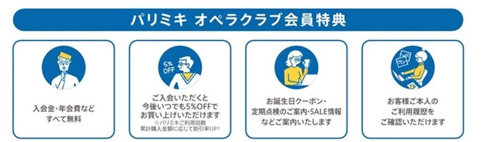 パリミキ オペラクラブは、入会金、年会費など無料ですが、入会にはパリミキ発行の店舗番号・お客様番号が必要です。入会希望の方は、店舗スタッフにお申し付けください。番号発行後はお手持ちのスマホ・パソコンからお申し込みが可能です。