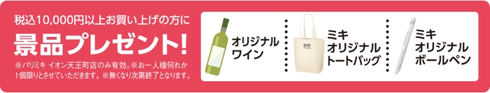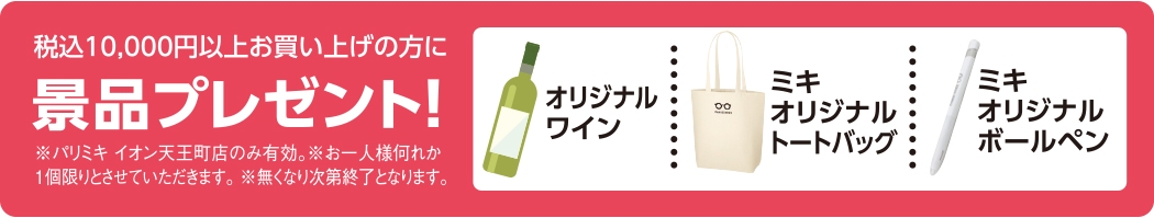 オープンを記念し10/18(火)~20(木)の3日間、税込10,000円以上お買い上げの方に、「パリミキオリジナルワイン・トートバッグ・ボールペン」のいずれか1つをプレゼント! ※無くなり次第終了となります。