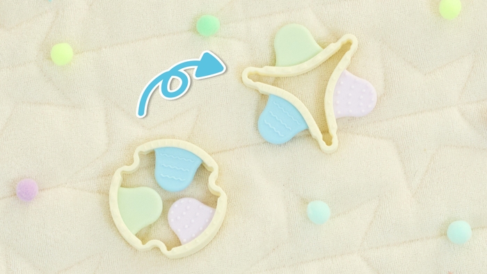 くるっとひっくり返して形が変わることで、いろいろな噛み心地や噛む位置を楽しめます。歯がためを卒業した後は、お子様の指先遊びとして使えるデザインです。