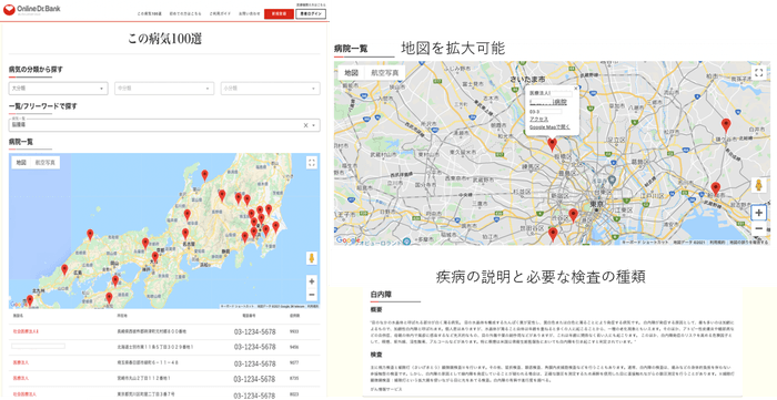 「この病気100選」は従来のオンライン診療の特徴であるオンラインのみだけに限定しない健康診断等の検査、診断から適切な受診勧奨を可能とし、患者の「どうしたら?」に対応した検索機能を提供します。厚生労働省の情報#3を日本地図上に診療実績豊富な医療機関をマッピングして、患者の住所の近くや、かかりつけ医と連携等を考慮し疾病単位毎100施設を表示検索できます。(下図)