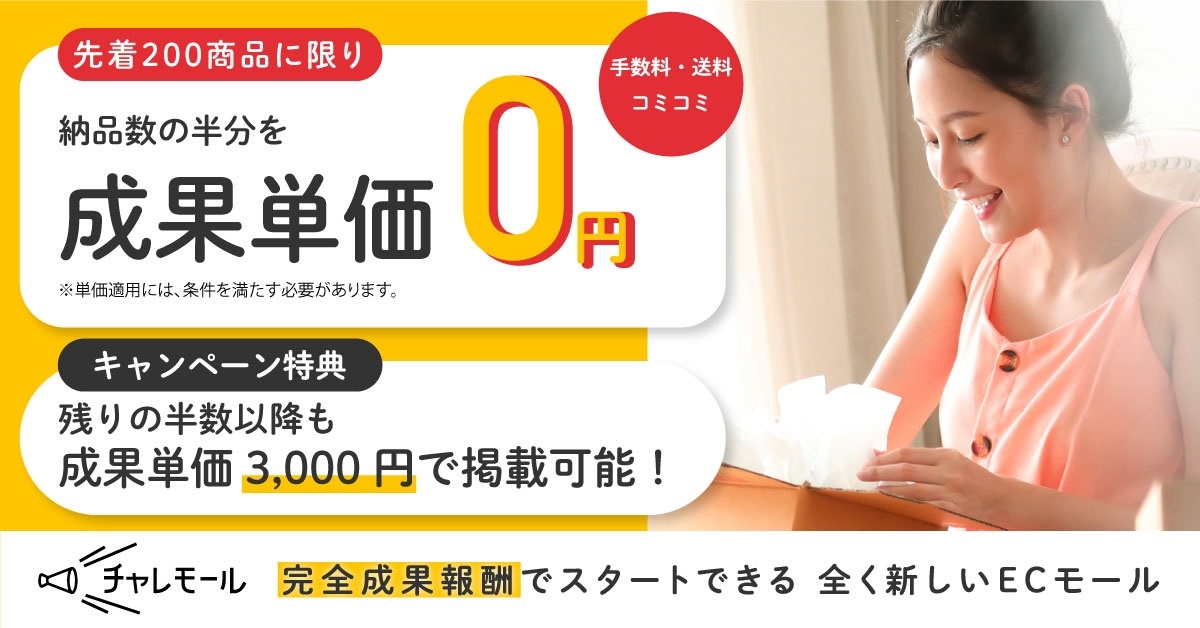 この度、リリース記念といたしまして、先着200商材限定で、成果単価3,000円(送料・倉庫管理費用0円)にてご提供いたします。さらに、初回商品納入分においては、納品数の半分を成果単価無料にて承ります。