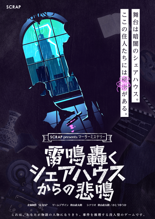 『雷鳴轟くシェアハウスからの悲鳴』は、プレイヤー4人が物語の登場人物になりきって会話や調査を行い、事件の真相の解明を目指す、SCRAP初のマーダーミステリーです。