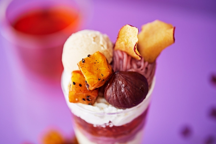 「紅いもモンブランパフェ」は、コクのあるまろやかな甘みの紅いもモンブランクリームをはじめ、大学芋、栗の渋皮煮、さつまいもチップスなど秋の味覚をたっぷりと詰め込んだ濃厚な味わいです。下層のフランボワーズソースやグラノラの食感がアクセントになり、最後まで飽きることなくお召し上がりいただけます。