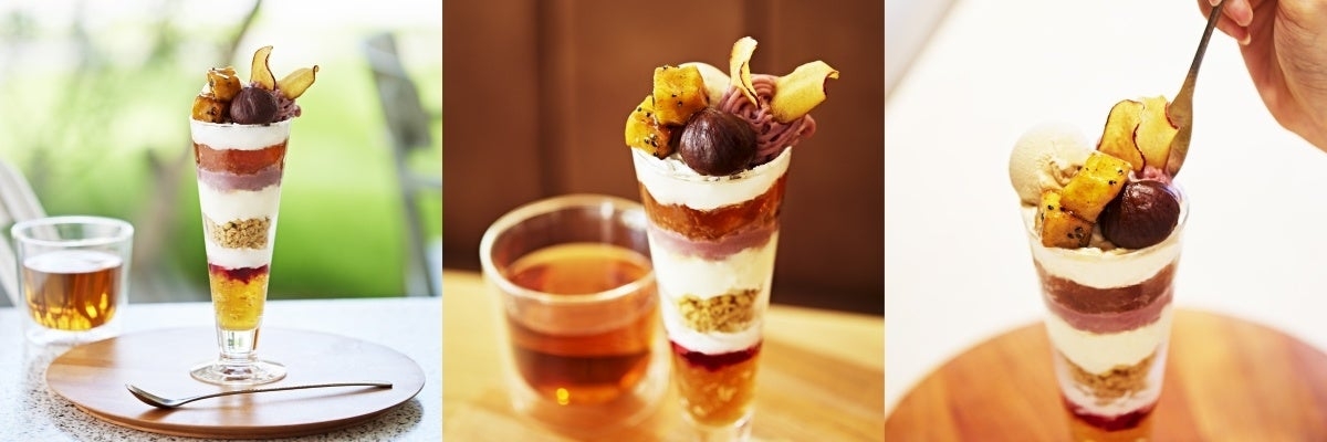 パフェはイートイン限定で、あたたかい東方美人茶とのセットをご用意しています。THREE TEA CAFEの秋スイーツで、おいしいお茶とともに素敵なティータイムをお過ごしください。
