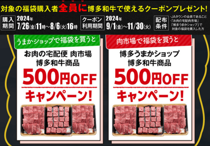 また「博多うまかショップ」で対象の福袋を購入した方全員へ、後日「お肉の宅配 肉市場」にて販売する博多和牛商品で使用できる500円OFFクーポンをプレゼントします。