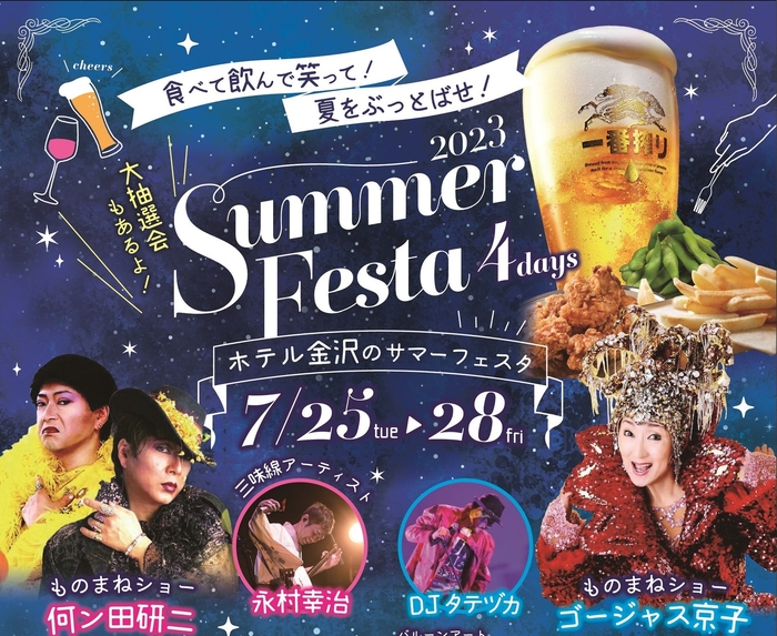 ホテル金沢株式会社(所在地:石川県金沢市堀川新町1-1、総支配人:小嶋 一夫 以下ホテル金沢)では、2023年7月25日(火)~28日(金)の4日間、毎夏恒例の「SUMMER FESTA」 を開催いたします。グランシェフ自慢のブッフェ料理に、ご協賛いただくキリンビール株式会社の生ビールをはじめとしたアルコール類、北陸コカ・コーラボトリング株式会社のソフトドリンクが飲み放題!腹筋が崩壊すること間違いなしの爆笑ものまねショーに、歌あり、ダンスあり、和太鼓あり、盛りだくさんのエンターテイメントです。