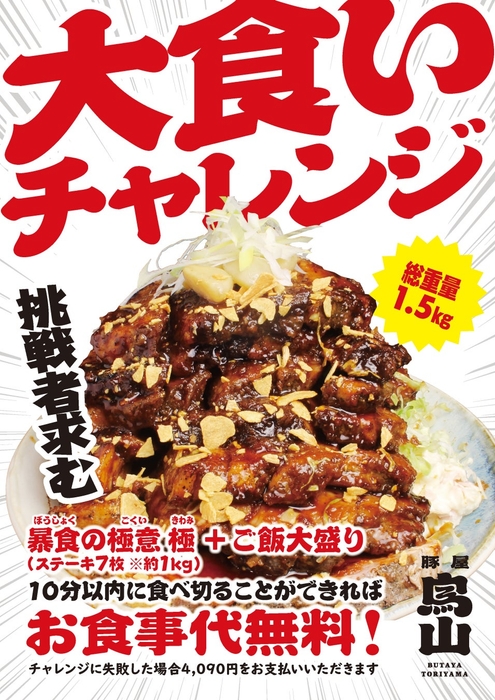 ポークステーキ7枚を重ねたチャレンジメニュー 4,090円。