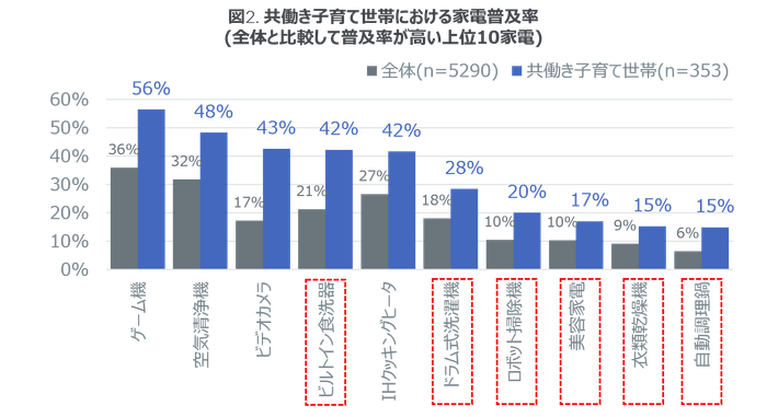 ・共働き子育て世帯では、ビルトイン食洗器、ロボット掃除機、ドラム式洗濯機など家事負担を減らす家電の普及率が全体と比べて1.5~2倍ほど高かった。