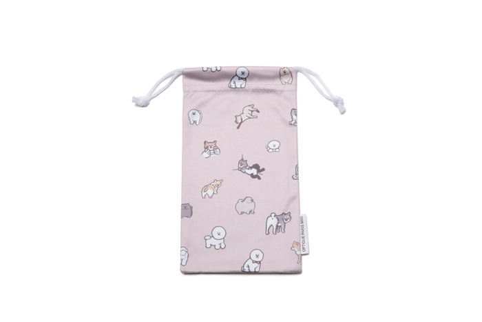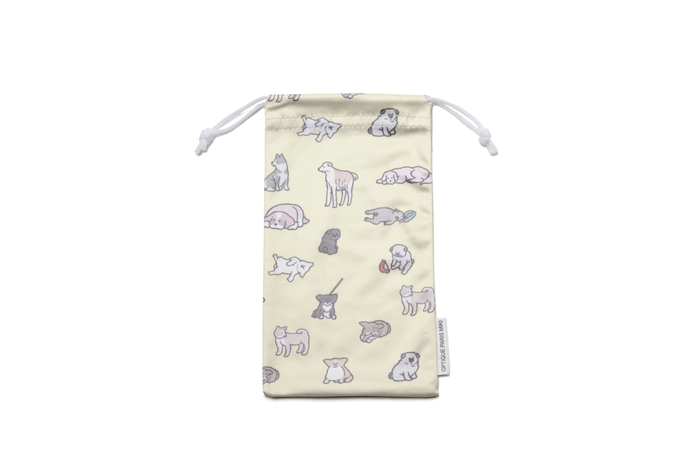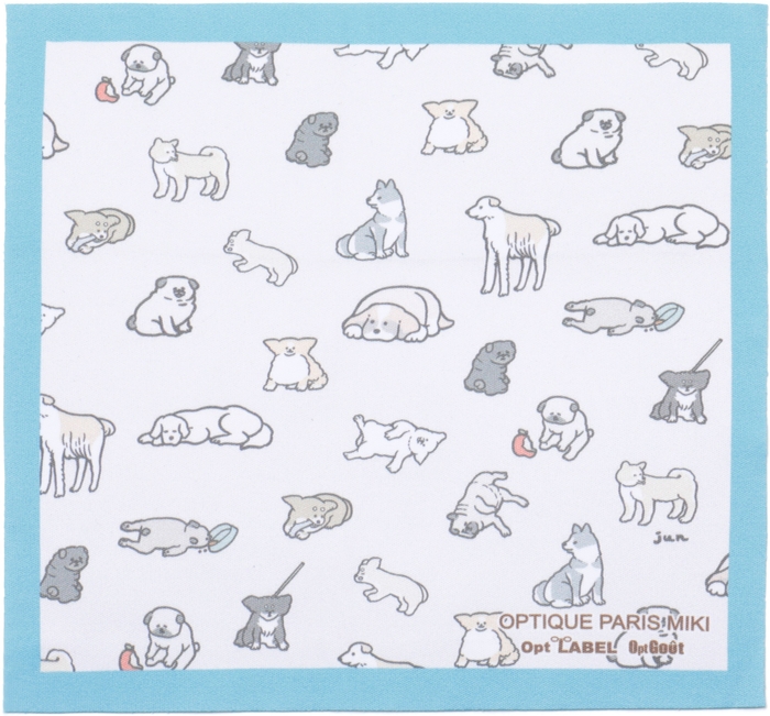 メガネケースの外側は裏表ワンポイントの印刷でシンプルにし、内側には元気なワンちゃんが集まる柄を施しています。